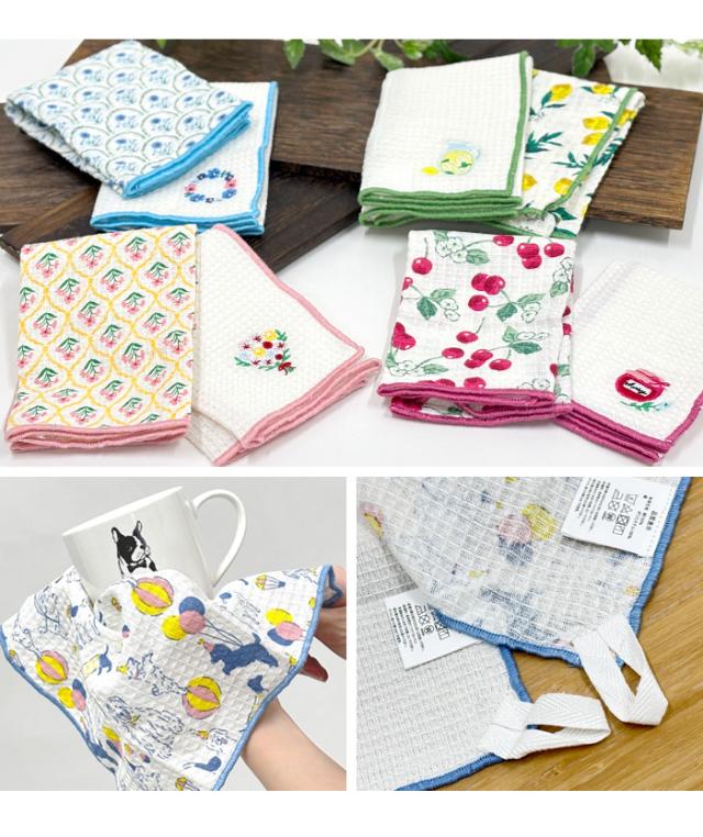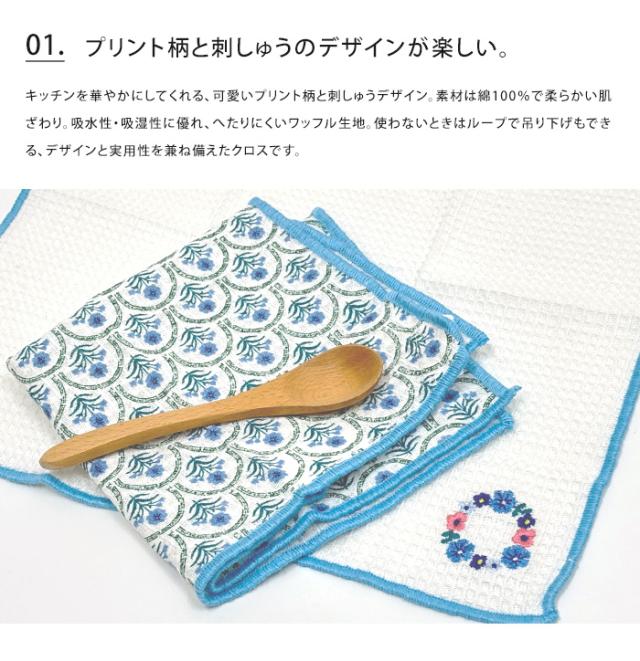 キッチンを華やかにしてくれる、可愛いプリント柄と刺しゅうデザイン。素材は綿100%で柔らかい肌ざわり。吸水性・吸湿性に優れ、へたりにくいワッフル生地。使わないときはループで吊り下げもできる、デザインと実用性を兼ね備えたクロスです。2枚をコードでおしゃれにまとめたパッケージは、可愛すぎないナチュラルなデザイン。お手頃な価格だから、退職や引っ越し・ご挨拶などのちょっとしたプレゼント・プチギフトにおすすめです。