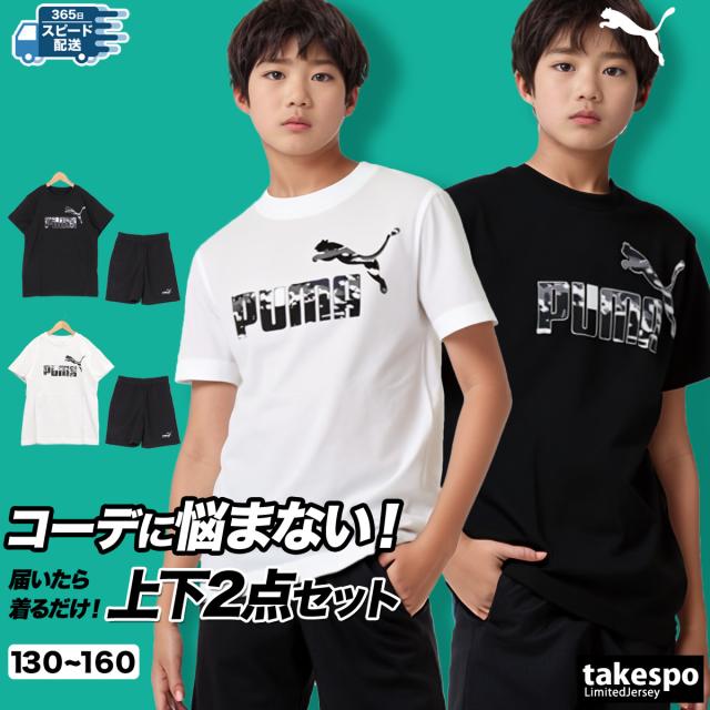 プーマ Tシャツ ハーフパンツ 上下 ジュニア セットアップ ブランド PUMA 半袖 綿混 クルーネック コットン100% 綿100% ESS カモ