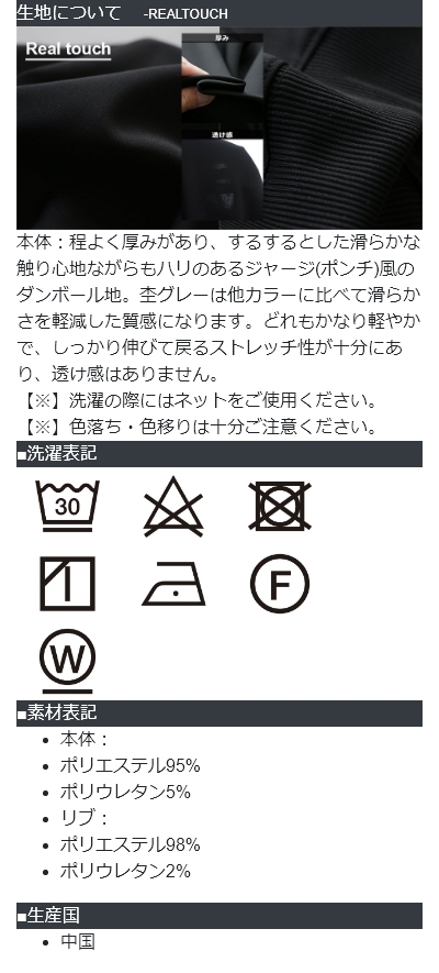 [素材]本体:ポリエステル95% ポリウレタン5% リブ:ポリエステル98% ポリウレタン2%