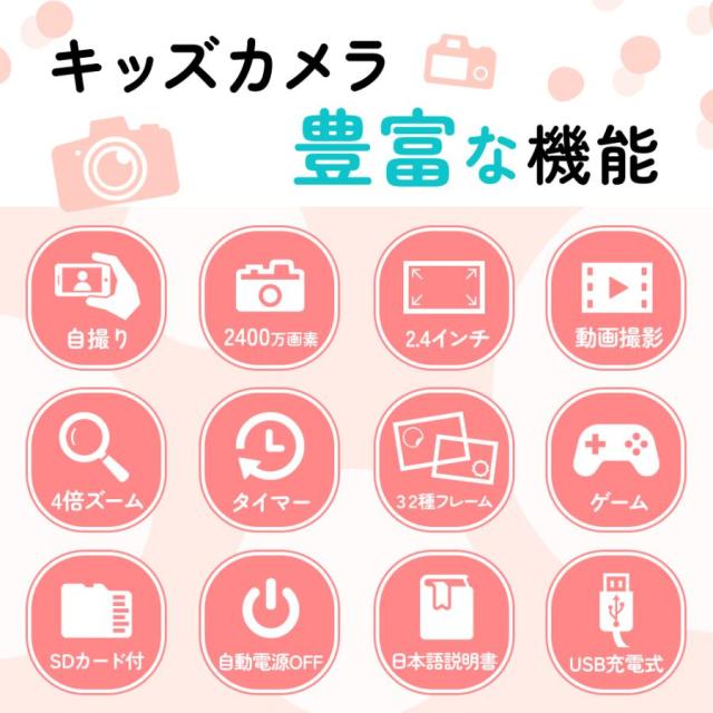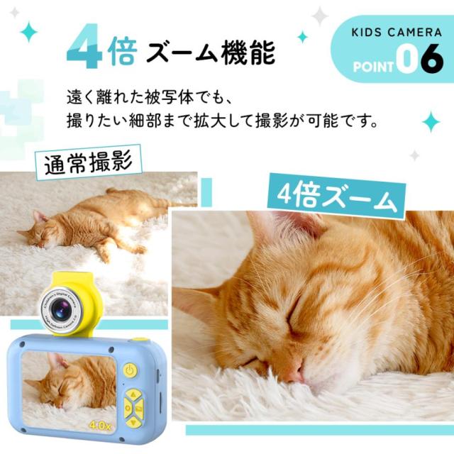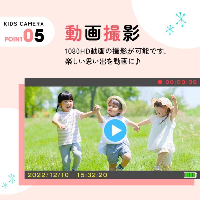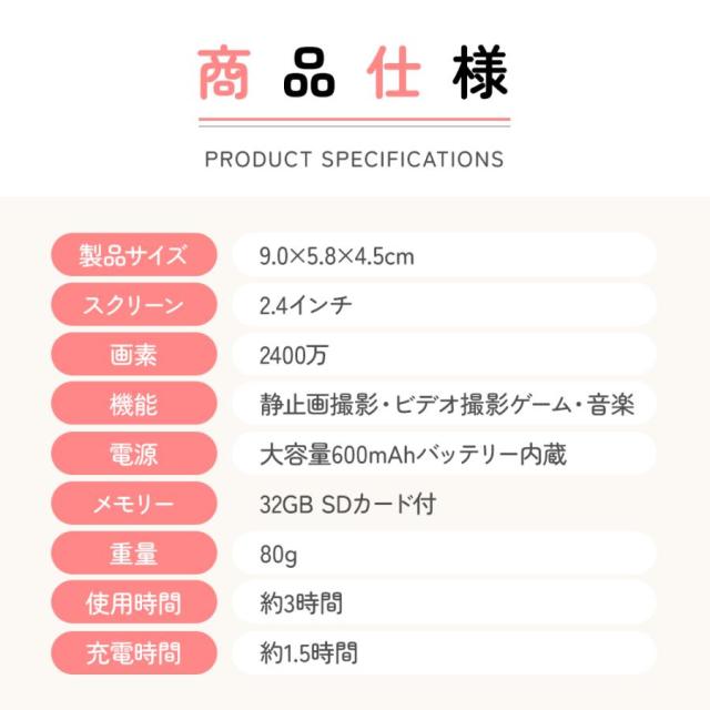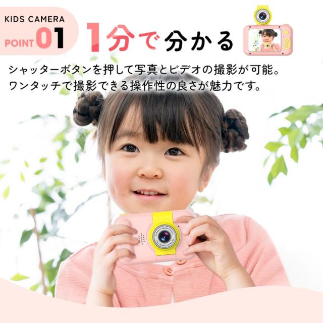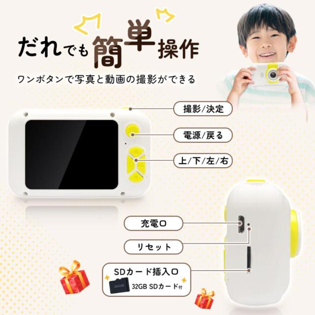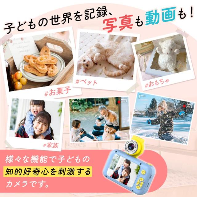 ボタンを押すだけで、最高の思い出の写真が簡単に撮れます。32GBSDカードが付属しており、約8500枚の写真が撮れます。写真だけではなく、映像もいっぱい撮れるので、大切な思い出をきれいに残しましょう。子供たちがいつでもどこでも魔法のような世界を体験し、子供たちのより豊かな想像力と創造性を養うことを可能にします。