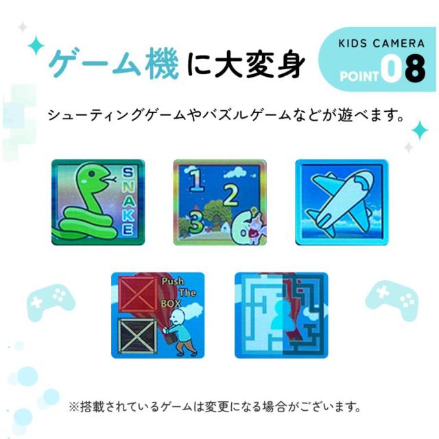 写真や録画のほか、レンズを180°反転するだけで自撮りを実現することができます。子供用カメラ にはタイマー撮影、32種類の写真フレーム、MP3音楽、5種類のゲーム、遅延録画、スローモーション録画、4倍ズームなど多彩な機能が含まれており、子供の好奇心を広げ、成長をサポートします。日付ラベルの追加もでき、大事な日を忘れずに記録しておきましょう。