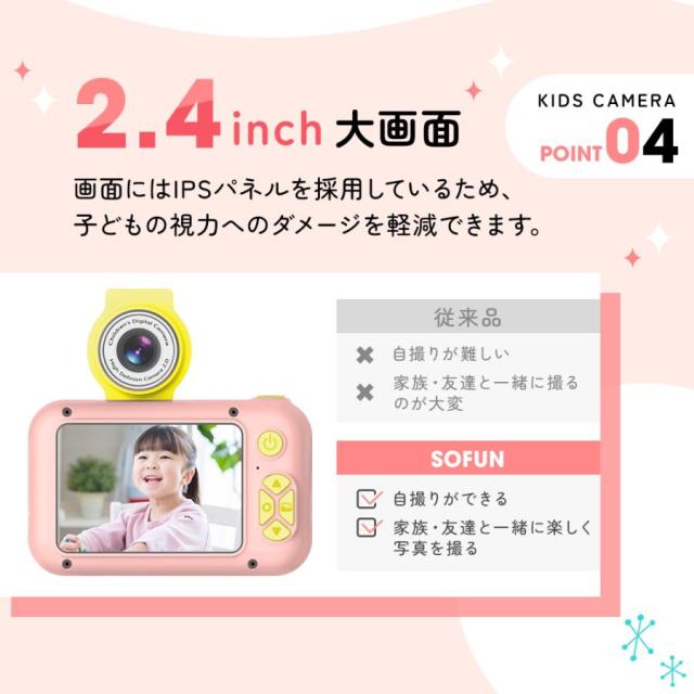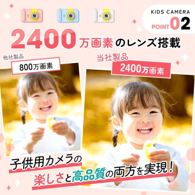 子供用デジタル カメラは最大2400万高画質と1080PフルHDで、完璧な撮影ができます。繊細なハイビジョン表示効果を実現でき、全ての細部をはっきりに観察できます。2.4インチIPS大画面をが搭載されていますが、他の 子供用カメラ と比較して子供の目を保護するのに役立ちます。世界が広がします。