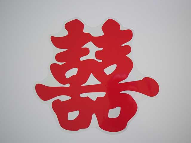 中華圏では双喜と言って幸福を呼ぶ漢字です。ガラスなど突起物の無い綺麗な平面に静電気で貼り付けるステッカーです。