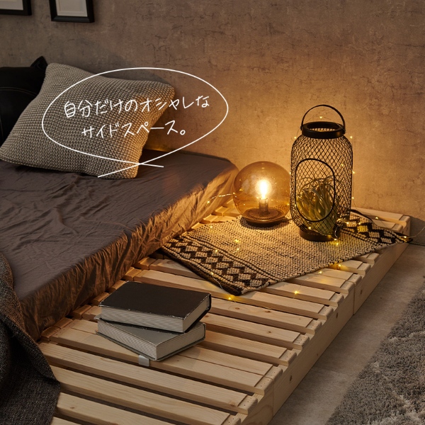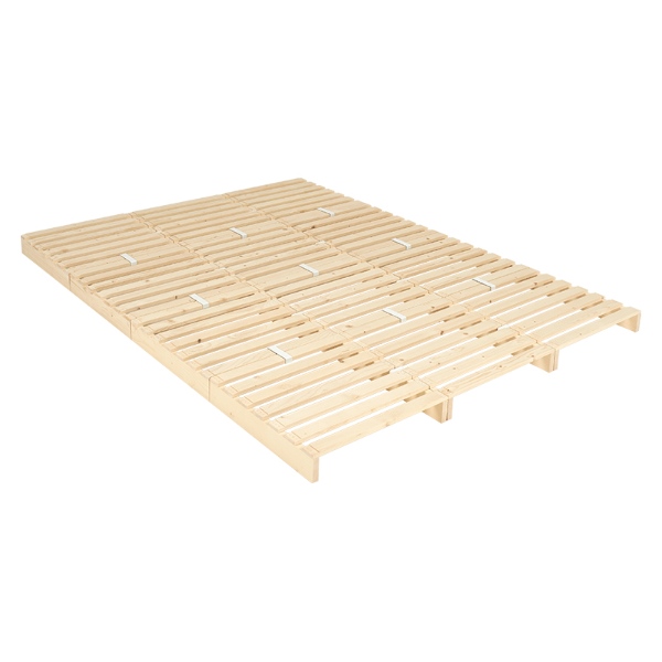 パレット状のすのこ板を並べるだけの簡単設置で移動や模様替えも楽々。 アレンジがしやすく、ライフスタイルが変わっても長く使用できます。 ■ベッドサイズタイプ ダブルベッド ■サイズ(約) 幅150cm×奥行200cm×高さ9cm ■素材 天然木(パイン) ■生産地 ベトナム ■備考 ・連結パーツ付き(縦用9個、横用8個) ・脚裏フェルト付き ■組立 簡単組み立て(パレットは完成品でお届け。工具不要で、パレットを並べて連結パーツで繋げるだけでベッドが完成。) ※お客様組立て品につきましては、組み立て後に不良の連絡をされても対応ができません。組み立て前にパーツに不良・傷等がないか、必ずご確認下さいますようよろしくお願い申し上げます。 ※記載は商品仕様の一部です。仕様説明不足等の理由での返品はできません。特に適合等は必ずご確認ください。