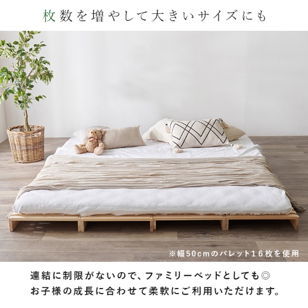 パレットを並べて連結パーツで繋げるだけでベッドが完成。
