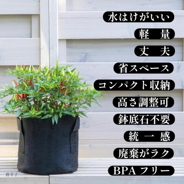 【素材】 ポリエステル製フェルト(不織布)BPA FREE 繰り返し使用可【サイズ】直径60x 高さ45cm 20号鉢 3個入【容量】128.7L/128.7kg【特徴】・通気性と透水性に優れた布製の鉢。過剰な水分がポット側面や床面から自然に外へ流れ出し適度な水分を保ちます。プラスチック製と比べて水はけがよく根腐れしにくいプランター・遮光性があり、高温時の根の痛みを防ぎます・ポット全体から排水するため根が四方へ伸びます。根が鉢の型に沿ってぐるぐる巻きつくルービングがありません・排水穴は無く、穴から虫やナメクジが侵入することはありません・取っ手付きでらくらく移動。ベランダ菜園も思いのまま・床への接地面が大きく抜群の安定感・使わないときは畳んで収納。かさばりません・用途は様々。道具入れや鉢カバーとしてもOK・人体への悪影響が指摘