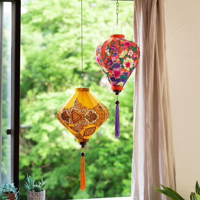 以前からご要望をいただいていた、ホイアン・ランタンの柄入りタイプがやってきました。明かりを灯した際も、模様が浮かび上がりとても綺麗です。灯りを消した日中も、柄入りなので華やかな印象。同じ色合いで揃えたり、逆に色と形をバラバラで並べても良く映えます。ランタンの生地は供給が不安定なので、それぞれの柄は一度きりの入荷になってしまう場合もございますので、予めご了承いただけますと幸いです。