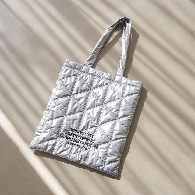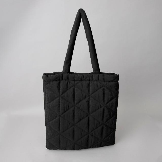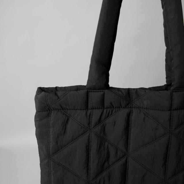 幾何学的なキルティングデザインが特徴的な、洗練された印象のトートバッグ。