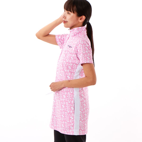 爽やかなロゴ柄が印象的なチュニック♪薄くてサラっとしたポリエステル素材で吸汗、UVカットと高機能なECO素材です。体型カバーが期待できるチュニックアイテムは大人コーデのマストアイテム!さりげない脇の切り替えが細見えに効果的!