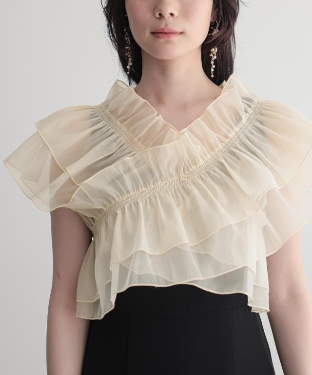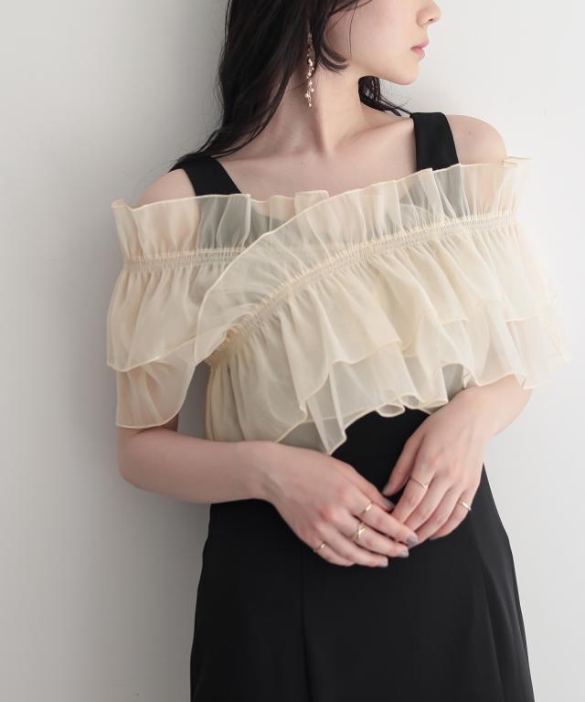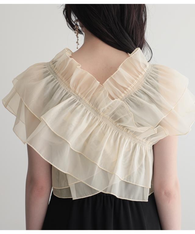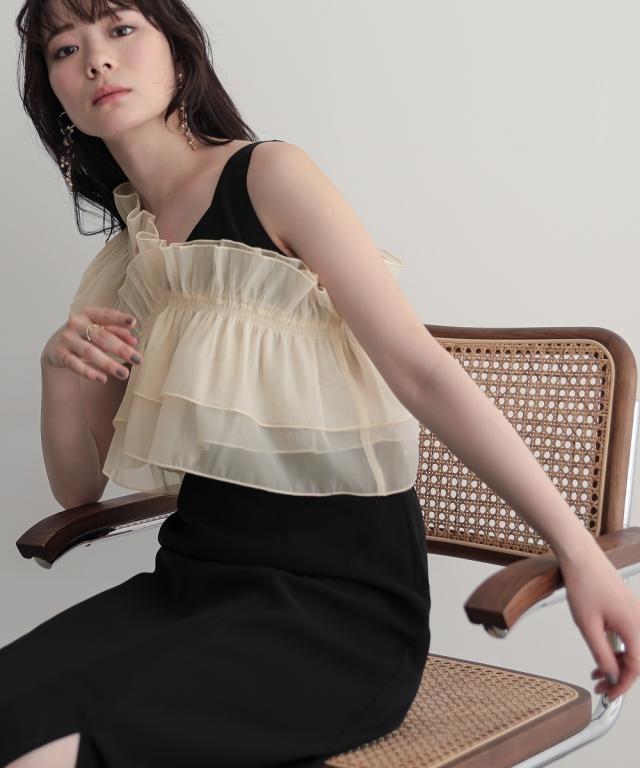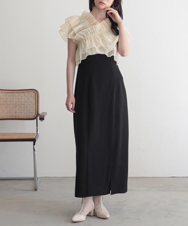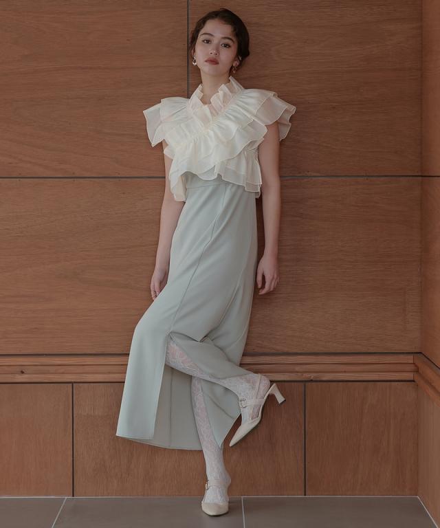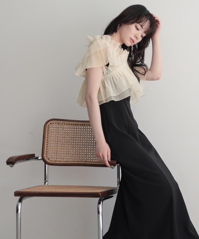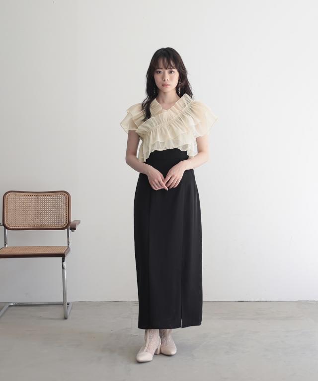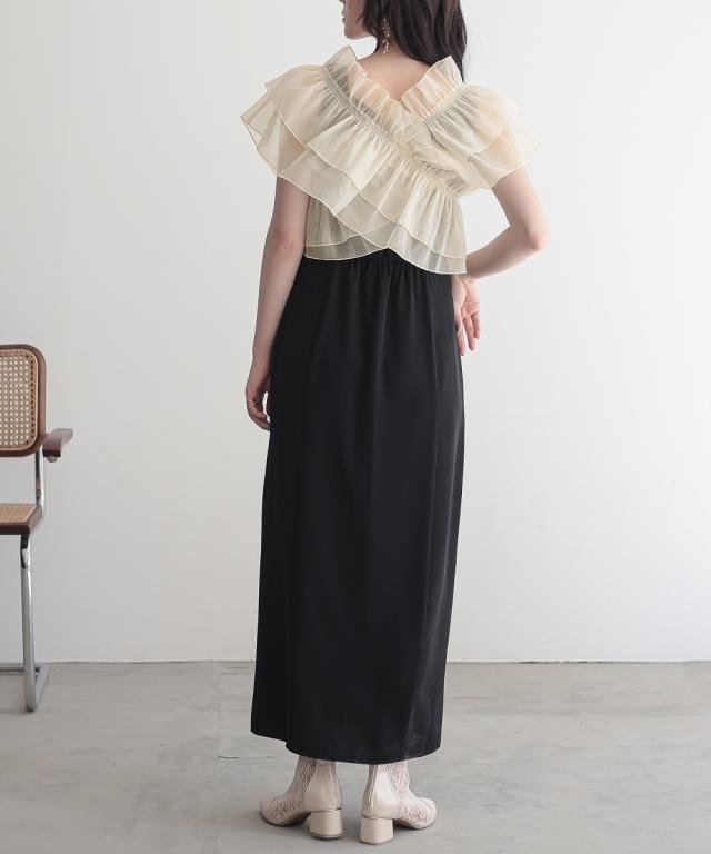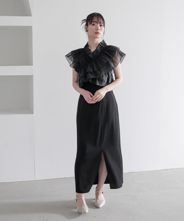 品質=[表地]ポリエステル100%(ジョーゼット) [フリル】ポリエステル100%(オーガンジー) [裏地]ポリエステル100%(サテン) 【裏地】有(総裏) ワンピース:左脇ホック付ファスナー開 ウエスト後ゴム入 前スリット ※繊細な生地を使用しているため、引っかかりなどにご注意ください。 原産国:中国製 備考:ドライクリーニング