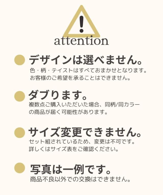 どんなブラジャーショーツセットが届くか、お楽しみ!こんな方におすすめ・いつも同じようなデザインを選びがちなので、自分では選ばないようなものが欲しい!・ドキドキワクワクを楽しみたい方※以下ご了承の上、ご購入をお願いいたします※・色や柄は選べません。・2セット以上ご購入の場合、デザインがダブる可能性がございます。・ソフトワイヤーが入ったブラジャーが含まれる場合があります。・パッドあり、なしが混在しているためパッドの有無は選べません。・ブラジャーサイズに事前にショーツがセットされていますので、ショーツサイズは選べません。※こちらのショーツはフィット感を重視したタイトめな仕様です。比較的小さめのショーツなのでぴっちりした着用感がお好みの方におすすめです。
