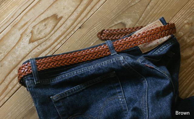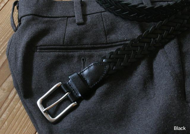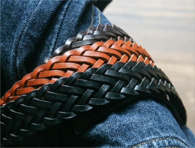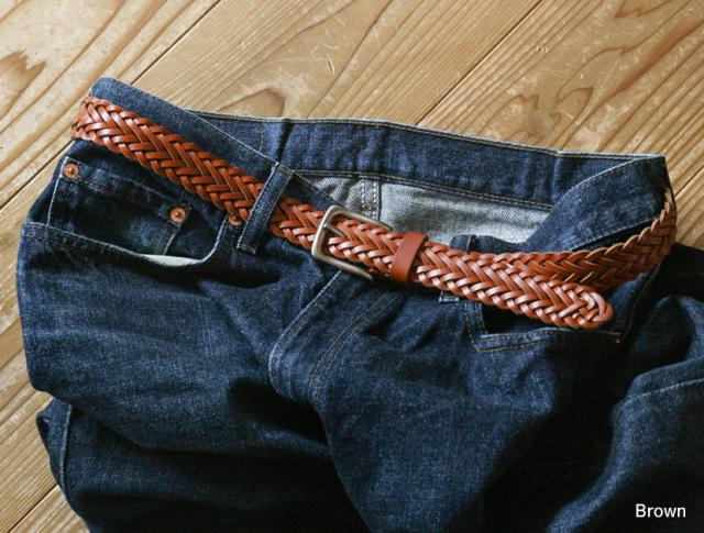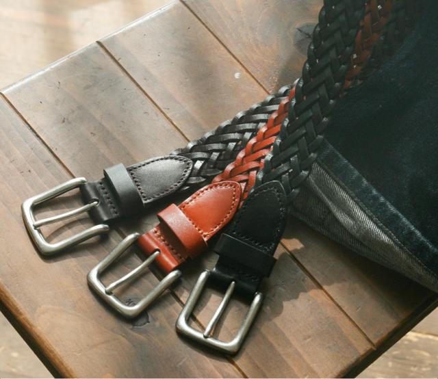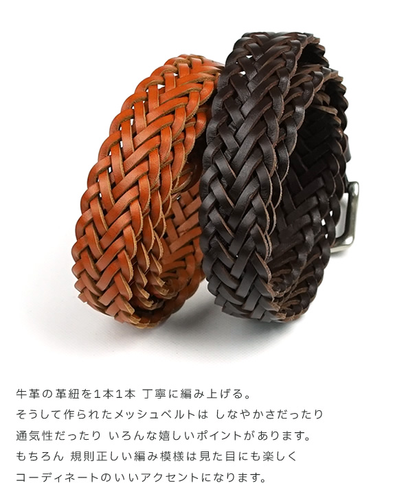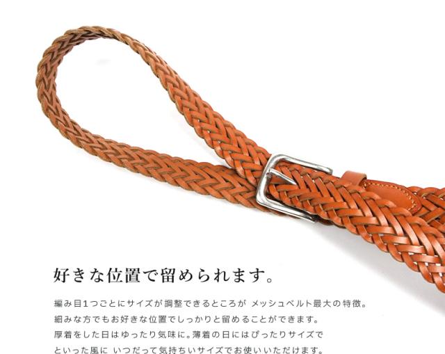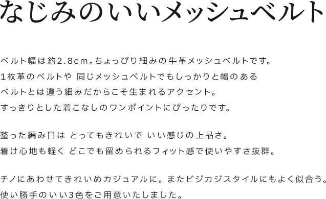 ベルト幅は約2.8cm。ちょっぴり細みの牛革メッシュベルトです。1枚革のベルトや同じメッシュベルトでも しっかりと幅のあるベルトとは違う 細みだからこそ生まれるアクセント。