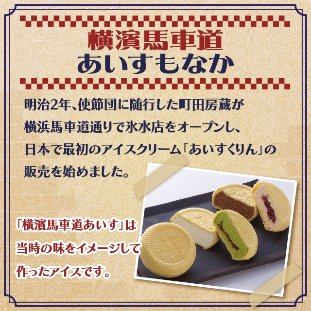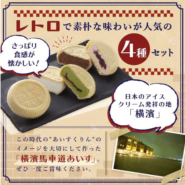- 横浜生まれのアイスをイメージした「横濱馬車道あいす」から、4種類の「あいすもなか」を楽しめるセットをお届けします。