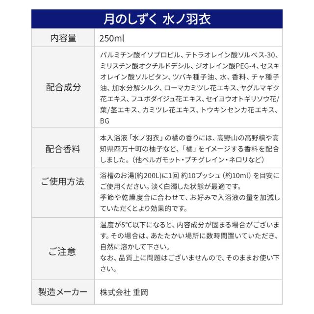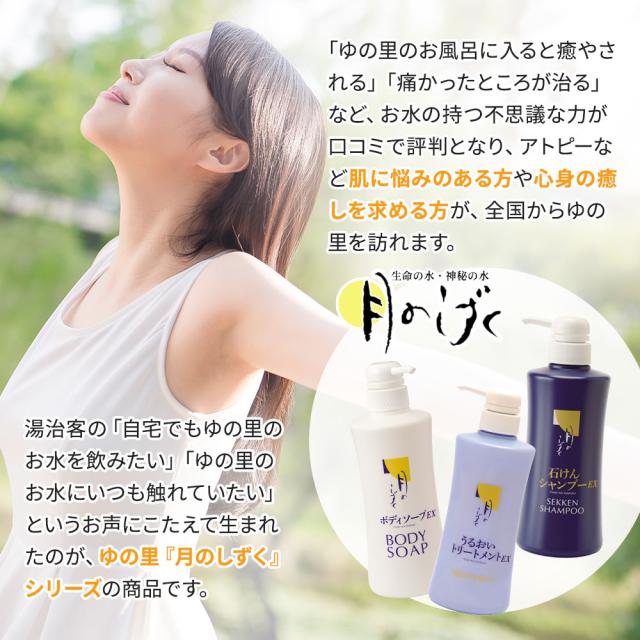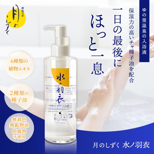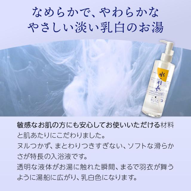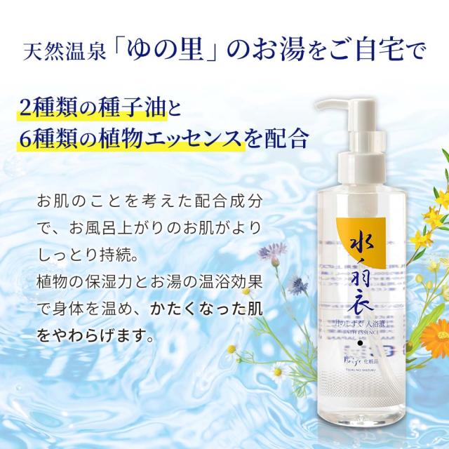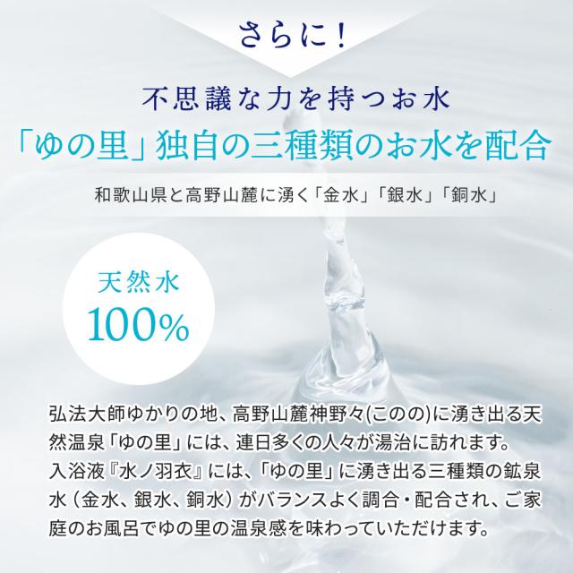 入浴液『水ノ羽衣』には、「ゆの里」に湧き出る三種類の鉱泉水(金水、銀水、銅水)がバランスよく調合・配合され、ご家庭のお風呂でゆの里の温泉感を味わっていただけます。