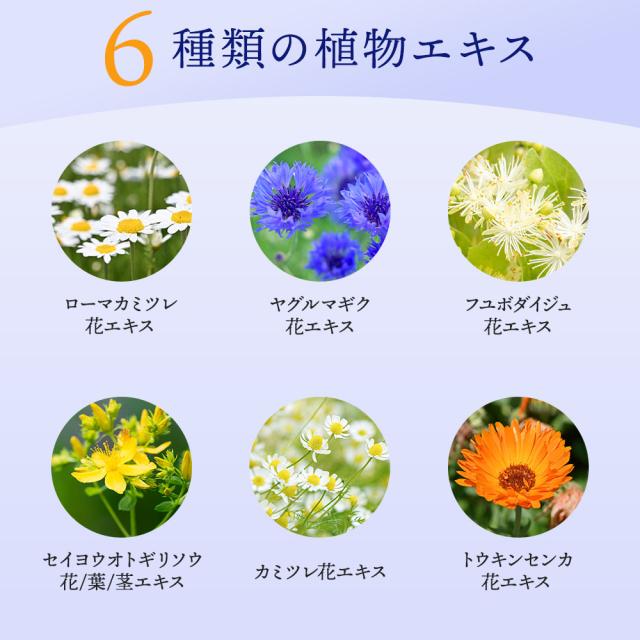 パルミチン酸イソプロピル、テトラオレイン酸ソルべス-30、ミリスチン酸オクチルドデシル、ジオレイン酸PEG-4、セスキオレイン酸ソルビタン、ツバキ種子油、水、香料、チャ種子油、加水分解シルク、ローマカミツレ花エキス、ヤグルマギク花エキス、フユボダイジュ花エキス、セイヨウオトギリソウ花/葉/茎エキス、カミツレ花エキス、トウキンセンカ花エキス、BG