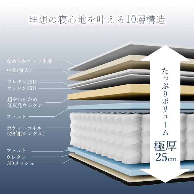 マットレス プレミアム 高級 ホテル ポケットコイルマットレス 厚さ25cm 硬め シングル 二層構造 快眠 へたりにくい 高品質 ポケットコイル ベッド スプリングマットレス 体圧分散 通気性 寝具 圧縮梱包