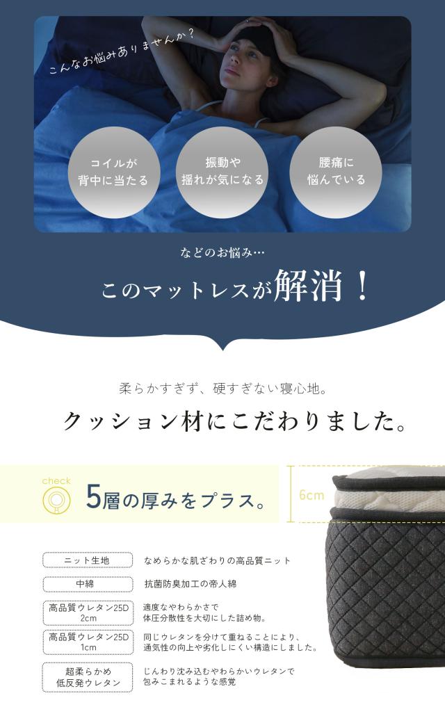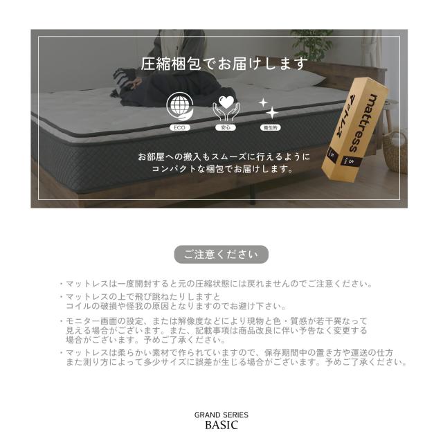 【備考】マットレスは一度開封すると元の圧縮状態には戻れませんのでご注意ください。商品の色味はモニターの機種や設定により実際の商品と異なる場合があります。予めご了承ください。商品の仕様は予告なく変更になる場合がございます。