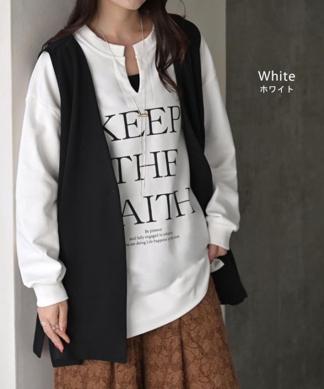 【冬SALE】 スウェット キーネック ロゴ トップス レディース トレーナー プルオーバー 無地 長袖 長い ロンT ドルマン Vネック スリット レイヤード リブ ドロップショルダー オーバーサイズ ゆったり 体型カバー 大きいサイズ お尻が隠れる 白 黒 春 夏 HUG.U