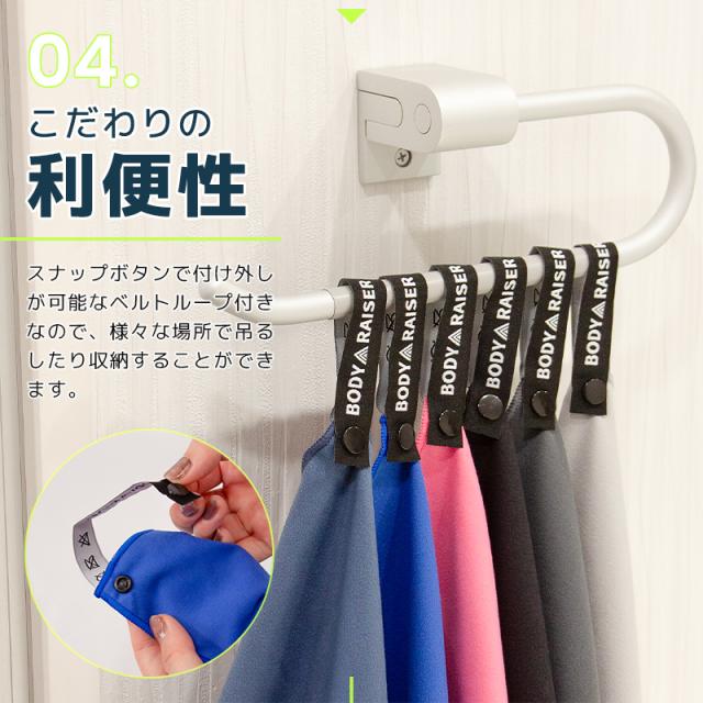 BODYRASER マイクロファイバー速乾タオルは、驚きの吸水力と速乾性が魅力です。一般の綿タオルの約3倍の吸水力で、濡れた体をサッと拭き取れます。さらに、速乾性が高いので、すぐに乾いて次の使用に備えられます。繰り返し使える高耐久性も嬉しいポイント。スナップボタンで付け外し可能なベルトループ付きで、持ち運びもラクラク。ゴルフやプール、アウトドア、キャンプ、旅行、サウナなど、様々なシーンで大活躍します!
