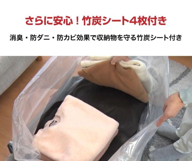 ●サイズ・重さ/収納ボックス:約幅75×奥行40×高さ30cm・約650g、圧縮袋:約幅110×奥行44×高さ100cm(厚さ0.08mm)・約230g、竹炭シート:約70×50cm・約10g、吸引機:直径約5.8×8cm・約150g