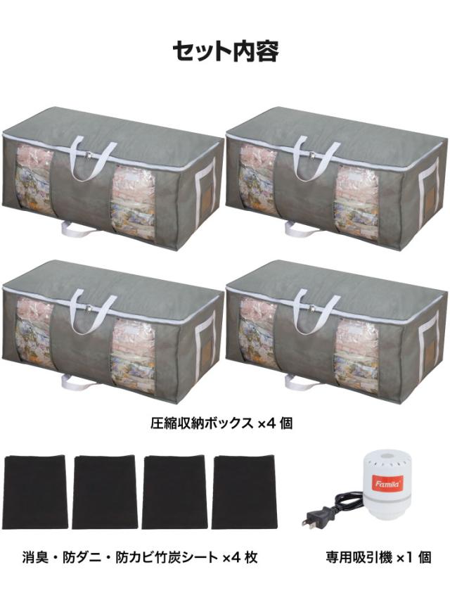 ●セット内容/収納ボックス4個(圧縮袋4枚付き)、竹炭シート4枚、吸引機1個