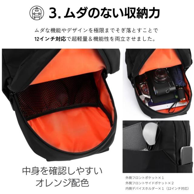 3.ムダのない収納力:ムダな機能やデザインを極限までそぎ落とすことで、12インチ対応で超軽量&機能性を両立させました!