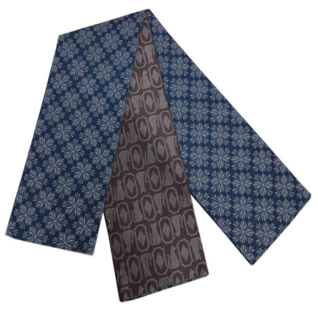 半巾帯 半幅帯 リバーシブル 濃青色地花菱 こげ茶地猫ダイヤ 日本製 洗える着物 小紋 細帯 小袋帯 女性用 レディース 猫柄 ねこ ネコ