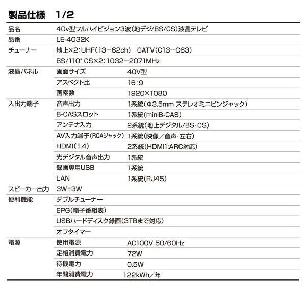 \40V型フルハイビジョン3波液晶テレビ LE-4032Kのここがポイント/ ■フルハイビジョン高画質で迫力の映像体験 画素数1920×1080の液晶パネルが細部まで鮮明な映像美を実現し、映画やスポーツ観戦が一層楽しめます。 ■ダブルチューナーで裏番組録画に対応 Wチューナー搭載により、テレビを視聴しながら別の番組を同時に録画できるので、見たい番組を逃しません。 ■豊富な接続端子で拡張性抜群 HDMI端子2系統、USB端子、LAN端子など多彩な接続オプションにより、様々な機器と連携して楽しめます。 ■大容量録画に対応した使いやすさ 最大3TBのハードディスクに対応し、お気に入り番組をたっぷり保存できるので、いつでも好きな時に視聴できます。 【高画質と使いやすさを兼ね備えた、あなたのリビングに最適な40型テレビですね!】 ■こんなお悩み、ありませんか? ・「仕事から帰ってきて、ゆっくり映画を楽しみたい。でも、スマホや小さいテレビでは物足りない…」 ・「家族がリビングのテレビを占領中。寝室やダイニングでも大画面でドラマを楽しみたい!」 ・「ゲームもPC作業も、画質が良い大きな画面でストレスなく使いたい。」 こんな風に、テレビのサイズや用途で悩んでいませんか? ■この一台で、映像体験が変わる! そこで登場するのが、「40V型フルハイビジョン液晶テレビ LE-4032K」! ・フルハイビジョン画質(1920×1080)で、映画もドラマもくっきり鮮明! ・ウラ録対応だから、見たい番組を逃さず録画!(※HDD別売り) ・HDMI2系統&USB端子搭載で、PC・ゲーム機・DVDプレーヤーも簡単接続! ・スピーカー搭載(3W+3W)で、クリアな音質も楽しめる! 大画面なのに、リビングだけでなく寝室やダイニングにもピッタリ! ■40インチで広がる、快適な暮らし リビングでは家族で映画鑑賞! 寝室ではゆったりドラマ三昧! ゲームもPC作業も、迫力の大画面でストレスフリー! もう「画面が小さい…」なんて悩む必要なし! 40インチの映像美が、あなたの暮らしをもっと豊かに。 この一台で、テレビの常識が変わります。 【サイズ】 本体:約(幅)893×(高さ)559×(奥行)207mm パッケージ:W952×D112×H576mm 【重量】 本体(スタンド付き): 約5.2Kg 【仕様】 チューナー:地上×2 UHF(13-62ch) CATV(C13-C63) BS/110°CS×2 1032-2071MHz 液晶パネル:画面サイズ 40V型 アスペクト比 16:9 画素数 1920×1080 入出力端子:音声出力 1系統(Φ3.5mmステレオミニピンジャック) B-CASスロット 1系統(miniB-CAS) アンテナ入力 2系統(地上デジタル/BS/110°CS) AV入力(RCAジャック) 1系統(映像/音声・左右) HDMI入力(1.4) 2系統(HDMI1:ARC対応) 光デジタル音声出力 1系統 録画専用USB 1系統 LAN 1系統(RJ45) スピーカー出力:3W+3W 便利機能:ダブルチューナー EPG(電子番組表) USBハードディスク録画(3TBまで対応) オフタイマー 電源:使用電源 AC100V 50/60Hz 定格消費電力 72W 待機電力 0.5W 年間消費電力 122kWh/年 壁面設置:VESA 200×200mm(M6ネジ) 使用条件:周囲温度0℃〜35℃ 周囲湿度20%〜80%(結露のないこと) 付属品:リモコン(動作テスト用単4形乾電池×2本)、スタンド(左右)、スタンド取付用ネジ×4本、B-CASカード、取扱説明書、保証書 【注意事項】 ●本製品は日本国内専用です。This product is designed for use in Japan only. ●本製品の補償内容は、保証書に記載されている保証規約に準じています。 ●本製品の仕様は改良のため予告なく変更されることがありますので、ご了承ください。 ●アンテナケーブルは付属しておりません。 ●本製品に接続可能なケーブルでも、外部機器との相性により接続しても使用できない場合があります。 ●ケーブルテレビや外部機器を接続の際は、それぞれの取扱説明書をお読みください。 ●電源コードのプラグは万がーの事故防止に備えて、すぐに外せるコンセントへ接続してご使用ください。 |
