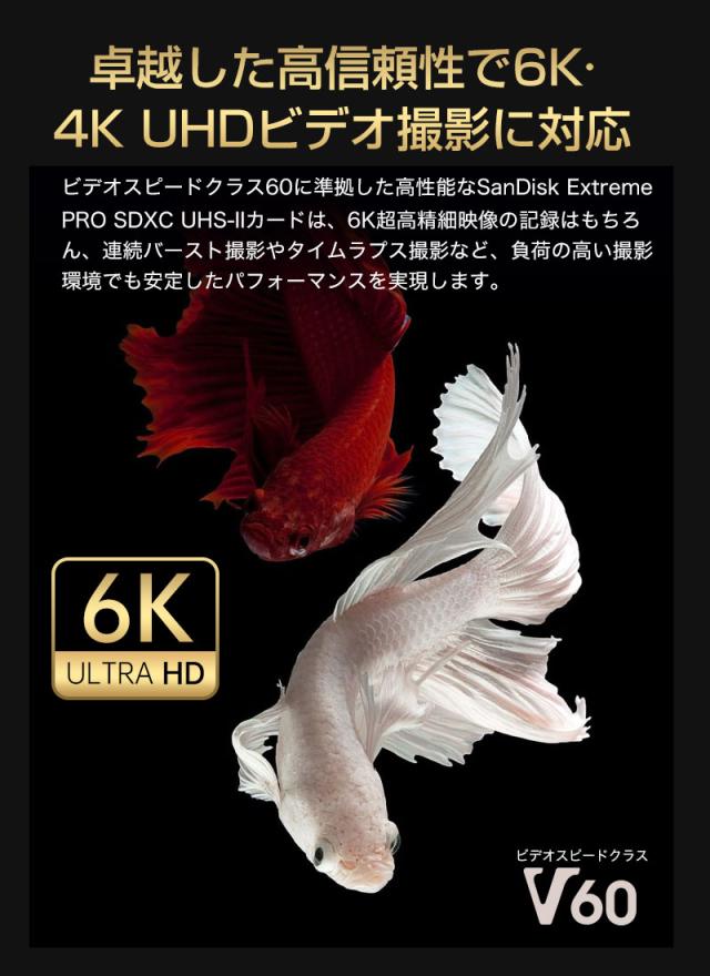 信頼性の高いビデオスピードクラス60のサンディスク エクストリーム プロ SDXC UHS-IIカードなら、高精細の6Kビデオに加え、連続バーストモードやタイムラプスの画像を録画できます。1TB容量で大量の高解像度コンテンツを保存でき、1年間のRescuePRO Deluxeファイル復旧サービス特典を使用して、誤って削除してしまったファイルを復旧できます。
