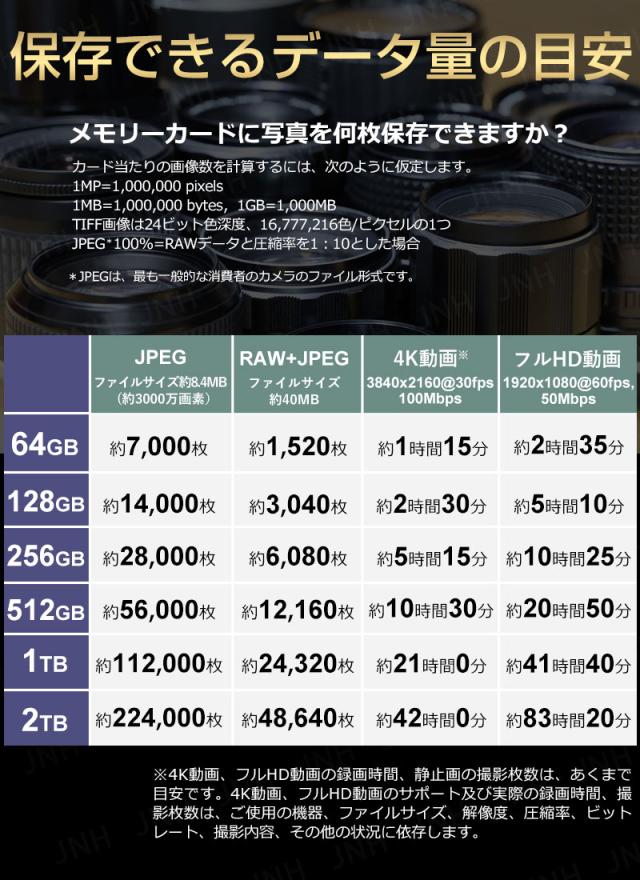 大容量のカードなら、容量を使い切ったり、撮影の合間にカードを交換することなく撮影に集中できます。高解像度のビデオキャプチャや高度な画像キャプチャモードでは、空き容量がすぐになくなってしまいます。
