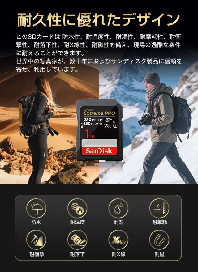 独自のNANDフラッシュメモリーを採用し、メモリーの安定性を最適化するカスタムフラッシュ管理テクノロジーにより、宇宙ステーションへの飛行や落下などの過酷な状況でもスムーズに動作します。業界パートナーと連携し、カードはラボで何百もの互換性のあるデバイスを使用して広範囲にテストされています。このSDカードは、防水性、耐温度性、耐湿性、耐摩耗性、耐衝撃性、耐落下性、耐X線性、耐磁性を備え、現場の過酷な条件に耐えることができます。世界中の写真家が、数十年におよびサンディスク 製品に信頼を寄せ、利用しています。