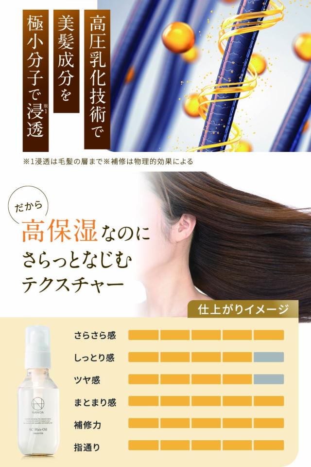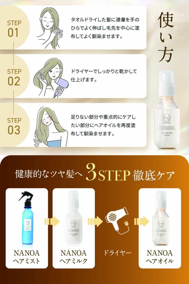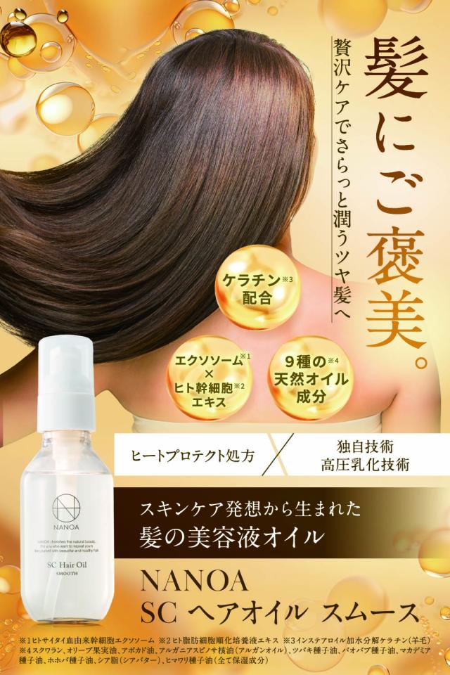 ◆ 【スキンケア発想から生まれた髪の美容液オイル】 「髪にご褒美。贅沢ケアでさらっと潤うツヤ髪へ。」 NANOAヘアオイルは、スキンケア発想から生まれた髪の美容液オイル。贅沢なオイルを使用しており、ダメージケア力が高いのにベタつきにくく、さらっとなじむ使いやすい使用感。