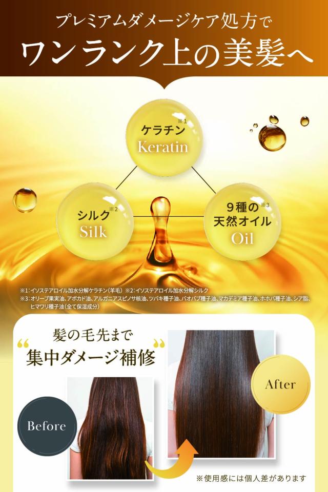 ◆ 【スーパーダメージケア処方】ケラチン×シルク×9種の天然オイル。髪への黄金バランスを追求。キューティクルの隙間を埋めるように補修することで、髪の内部からダメージを徹底補修します。