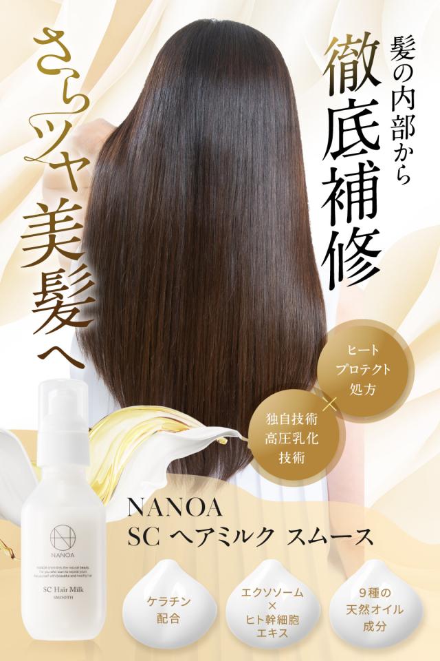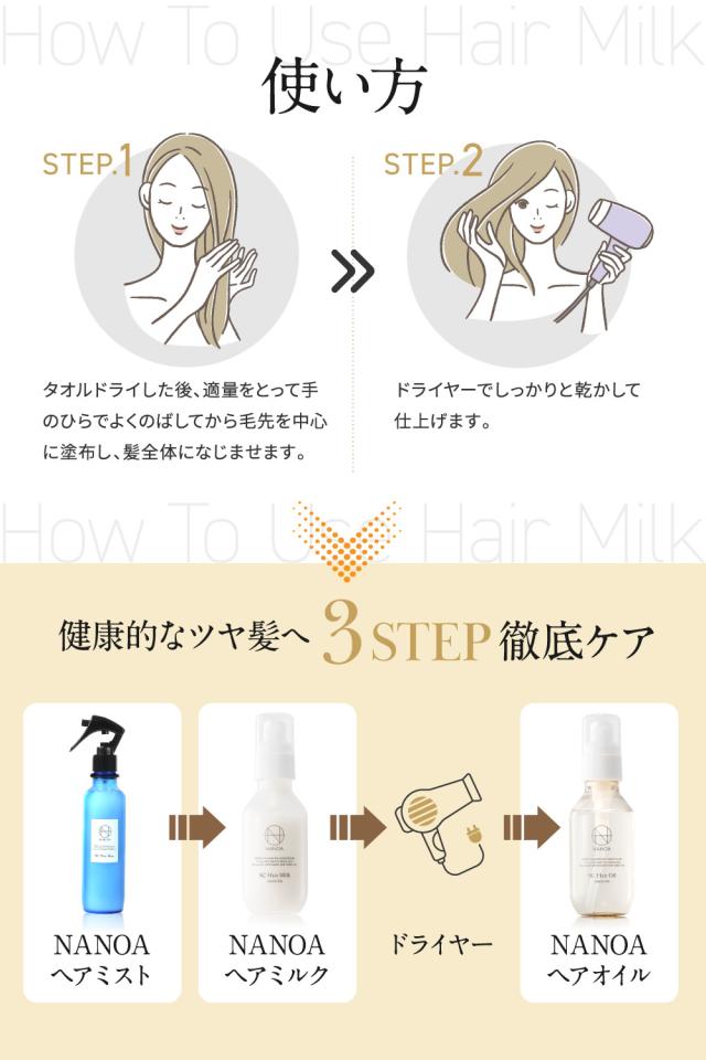 ◆【スキンケア発想の高機能ヘアミルク】 「髪の内部から徹底補修 さらツヤ美髪へ」 NANOAヘアミルクは、スキンケア発想から生まれたヘアミルク。高保湿なのにさらっとなじむ使いやすい使用感、上品でさわやかなホワイトフローラルの香りをお楽しみください。