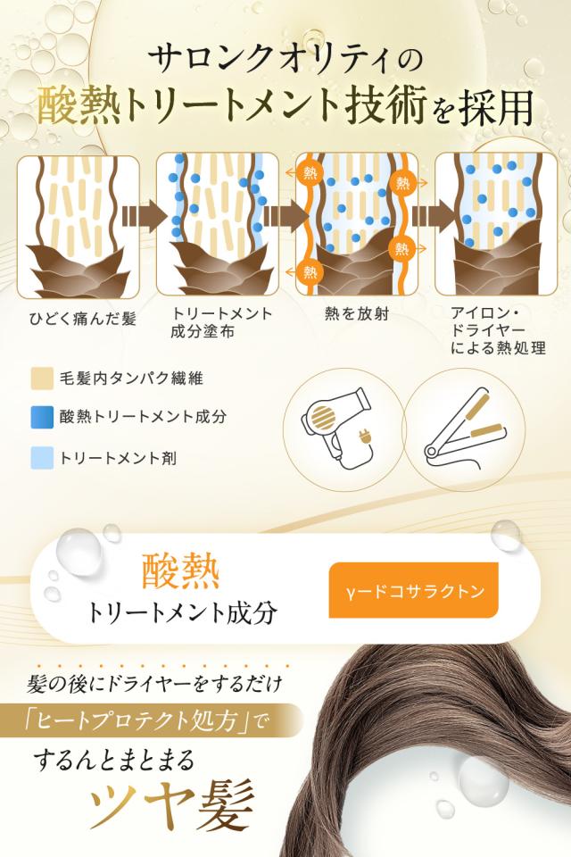 ◆【サロンクオリティの酸熱トリートメント】. 酸×熱のチカラでトリートメント補修。ひどく痛んだ髪に、トリートメント成分「γードコサラクトン」を配合。アイロン・ドライヤーなどを熱を加えることで浸透させます。ヒートプロテクト処方でするんとまとまるツヤ髪へ。