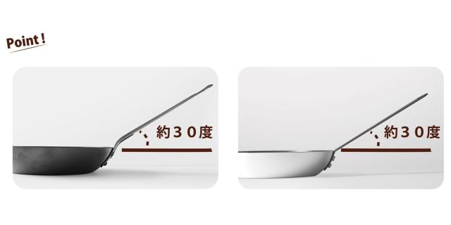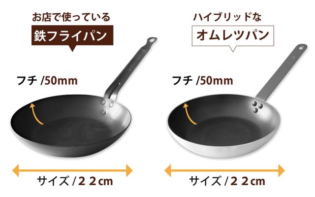 フチの長さは約5cmで、卵をまとめやすいなだらかな形状。実際にたいめいけんで使われている鉄製フライパンと同じ22cmで、茂出木シェフこだわりのサイズです。