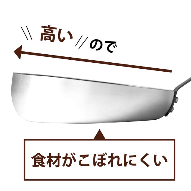 本体は片側が高くなっており、鍋返しを行う際に食材がこぼれにくい形状です。具材などが飛び散りにくいので、くるっ、くるっと簡単に返せちゃいます。もちろんチキンライス以外も炒め物なら何にでも便利です。