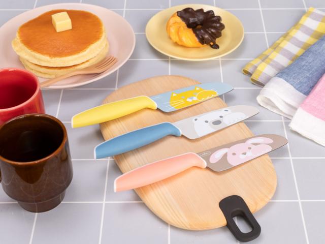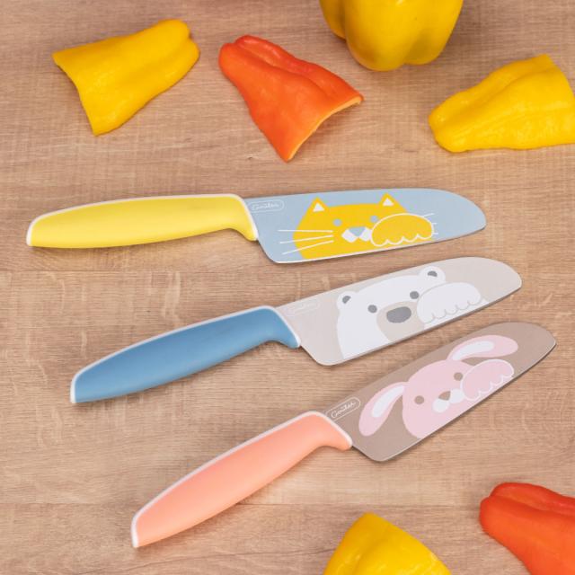 どうぶつのイラストが可愛い包丁は、イエロー(ねこ)、ピンク(うさぎ)、ブルー(白くま)からお選びいただけます。