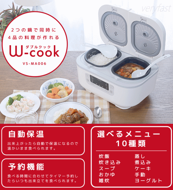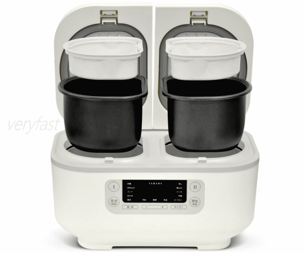 2つの鍋で同時に2品の料理が作れる!ご飯を炊きながら同時におかずも作れちゃう!もちろん片方だけでも使用可能。内釜にはフッ素加工がされているので食材がくっつきにくくお手入れも簡単です。付属の蒸しプレートを使えば蒸し調理も可能!出来上がったら自動で保温になるので温かいまま食べられます。食べる時間に合わせてタイマー予約したらいつも出来立てを食べられます。選べるメニューは炊飯・炊き込み・スープ・おかゆ・雑炊・蒸し・煮込み・ケーキ・手動・ヨーグルトとなんと10種類!■製品サイズ約W345×D235×H195mm■製品重量約3.5kg■電源AC100V 50/60Hz■定格消費電力700W(350W×2)■コードの長さ約1m■材質:プラスチック、シリコーン、金属他■セット内容:本体、内釜×2、蒸しプレート×2、しゃもじ、おたま、計量カップ、取扱説明書(保証書)※本製品は一般家庭用です。業務用等にご使用にならないで下さい。本製品は仕様上6〜12時間まで保温できますが早めに冷蔵庫・冷凍庫での保存をおすすめします。白米以外の保温はしないで下さい。長時間の保温はしないで下さい。