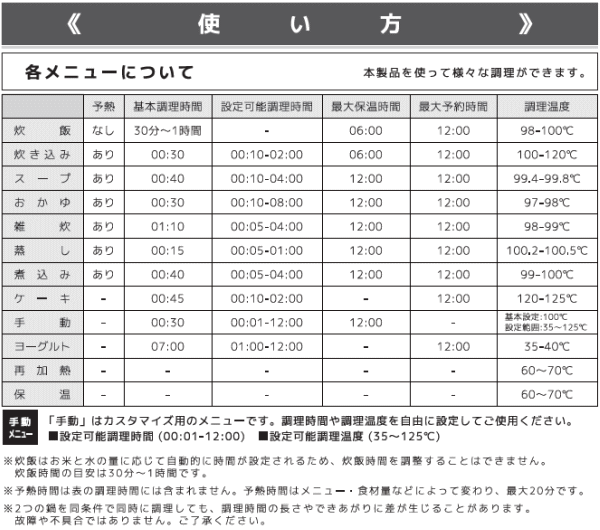 ※白米以外の保温はしないで下さい。