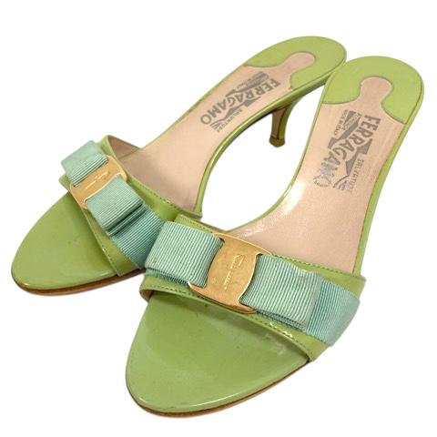 【中古】サルヴァトーレフェラガモ ミュール サンダル ヴァラ リボン オープントゥ 7 1/2 イエローグリーン ライトブルー レディース