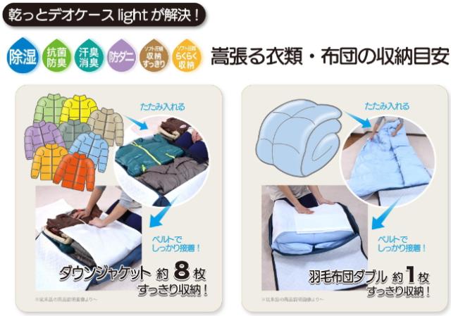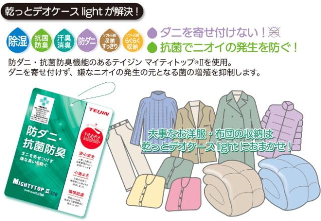 収納スペース・ニオイ・ダニ・カビ・湿気に悩んでいる方、これ1個で季節もの収納お任せ!テイジンの独自機能によりダニ、カビ、臭いを予防し、さらに使いやすさを追求しコンパクト収納になっているので、特に衣替えのシーズンにおすすめです。【かさばる衣類・布団もしっかり収納できる軽圧縮タイプ!】●大サイズは、ダウンジャケット約8枚、ダブルサイズの羽毛布団も収納可能(小サイズは、ダウンコート約4〜5枚、Tシャツ約20枚程度)●ソフト圧縮ベルトが付いているのでかさばりにくく、すっきり収納できます。【ニオイ・湿気から衣類を守る除湿&防臭!】●吸湿性・消臭性に優れた帝人の機能素材ベルオアシスを使用!●大事なお洋服・お布団を湿気・汗の臭い・梅雨や結露からしっかり守ります。【ダニや菌を寄せ付けない防ダニ・抗菌機能!】●SEKグリーンマークを取得した防ダニ・抗菌・防臭加工素材のマイティトップ2を使用!●ダニを寄せ付けず、嫌なニオイの発生源となる菌の増殖を抑制します。●収納にお困りのお客様からの長年の実績!