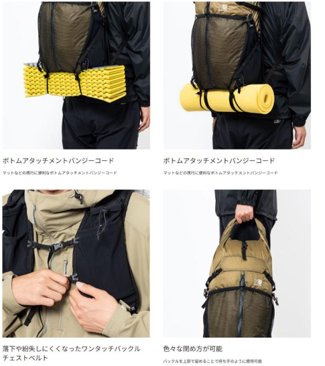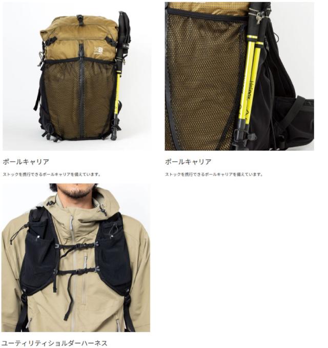ユーティリティショルダーハーネスなど豊富な機能を装備させ「行動しながらの快適な操作性」「荷物の出し入れ・撤収のしやすさ」「軽さ」を合わせ持ったモデル。