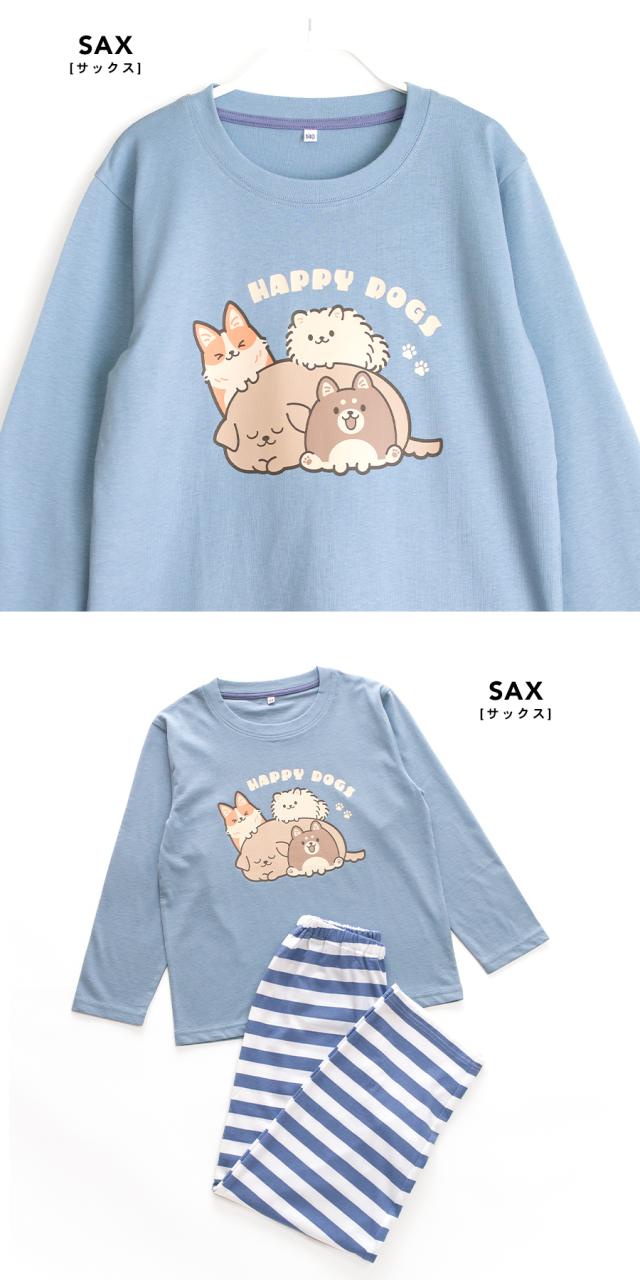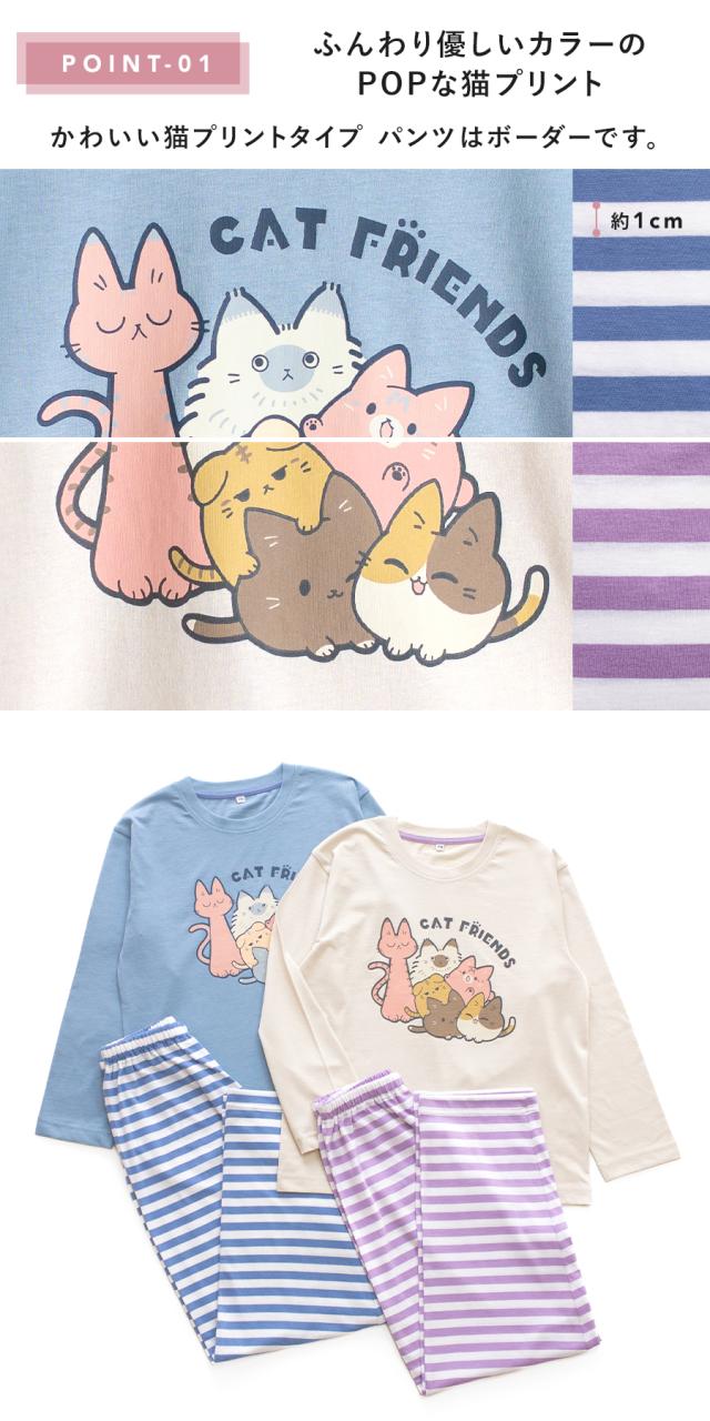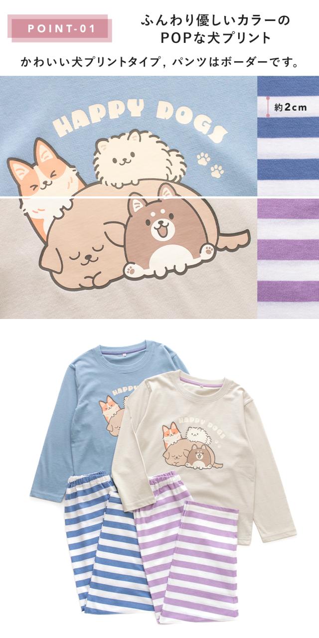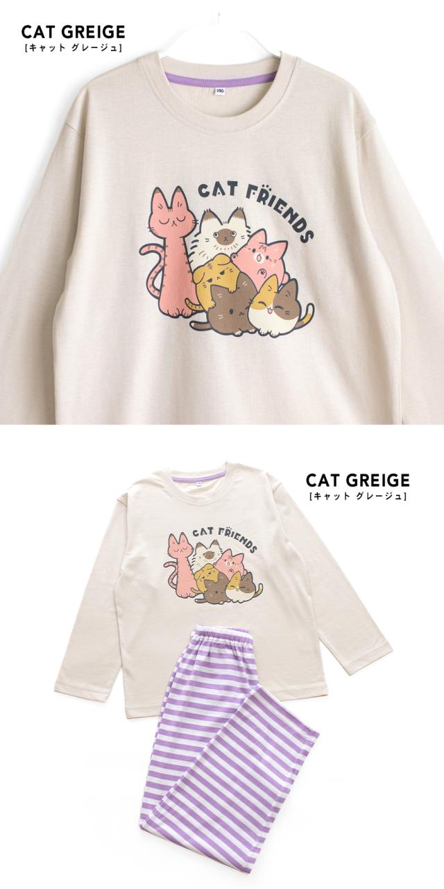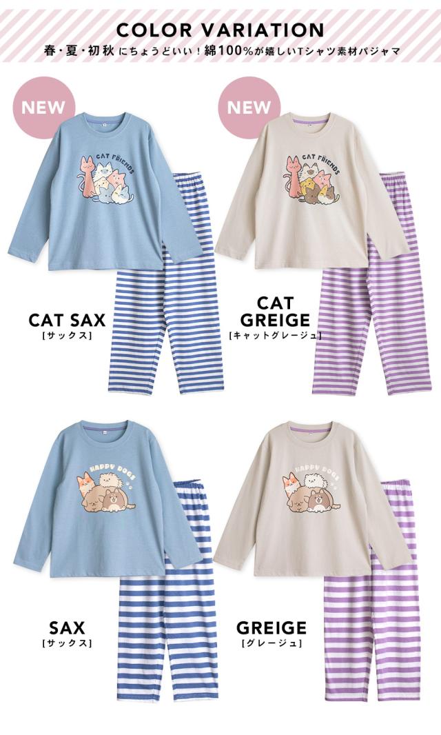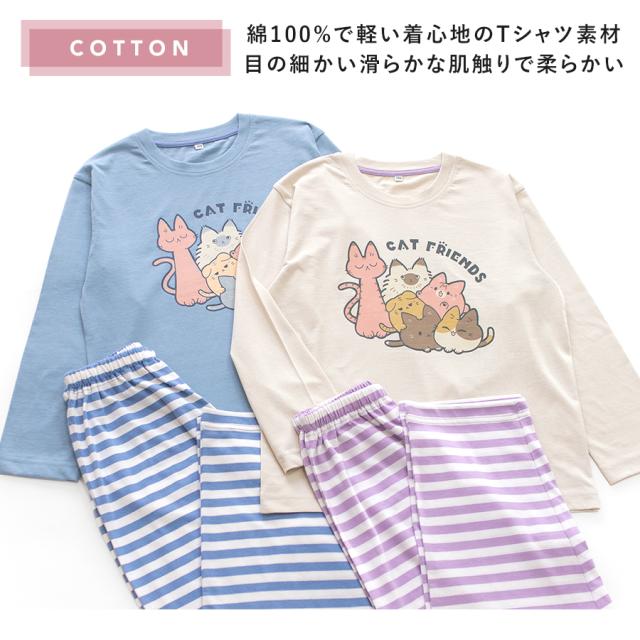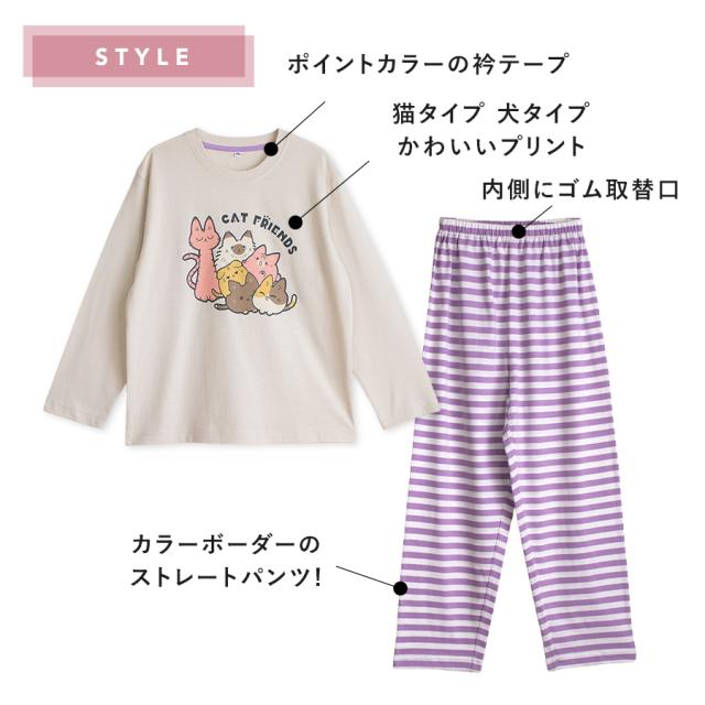パジャマ キッズ 女の子 綿100% 長袖 春 夏 柔らかく軽い薄手の快適Tシャツ かわいい 猫プリント 犬プリント ボーダー長パンツ グレージュ ブルー 130 140 150 160 子供 ガールズ ジュニア 部屋着 ルームウェア メール便なら 送料無料