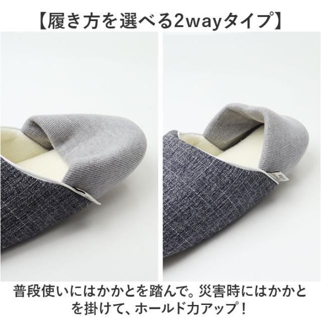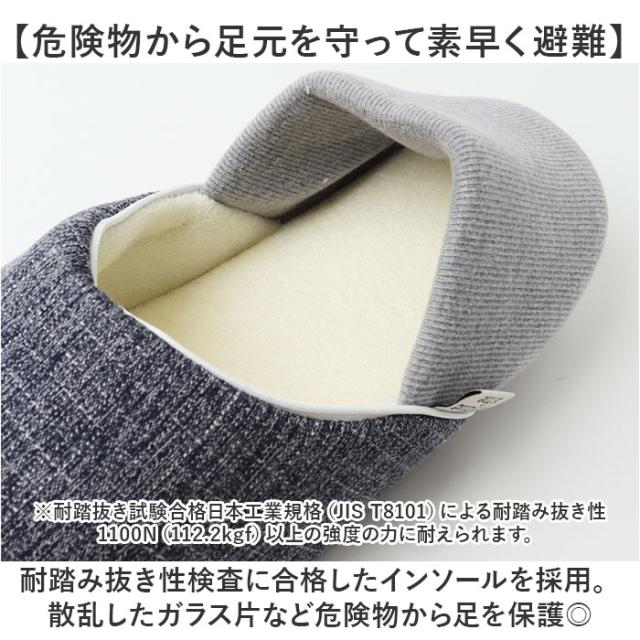 | 商品説明 | 【日常生活も、防災時もお任せ!】 ・日常使いしながら、備えるアイテム。「ANYTIME IS FINE 防災スリッパ」。 【危険物から足元を守って素早く避難】 ・耐踏み抜き性検査に合格したインソールを採用。散乱したガラス片など危険物から足を保護◎ (※)耐踏抜き試験合格日本工業規格(JIS T8101)による耐踏み抜き性1100N(112.2kgf)以上の強度の力に耐えられます。 【暗闇でも探しやすい蓄光テープ】 ・履き口には蓄光生地のパイピング。暗所で光るので、消灯後もしばらくは見つけやすい! 【左右迷わず、緊急時にサっと履ける】 ・左右同型に設計。迷うことなくスムーズに足入れできて、慌てずに対応。 【履き方を選べる2wayタイプ】 ・普段使いにはかかとを踏んで。災害時にはかかとを掛けて、ホールド力アップ! 【手洗いできてお手入れラクラク】 ・汚れが気になったら、自宅で手洗い可能。いつも清潔をキープできるのが嬉しい! 【滑りにくく拭き取りもできる底材】 ・安定した歩行をサポートする、程よい滑り止め効果。汚れてもひと拭きすればOK。 【シンプルなナチュラルデザイン】 ・履く人を選ばず、デイリーに使える仕上がり。家族色違い&サイズ違いで揃えるのもおすすめ。 |