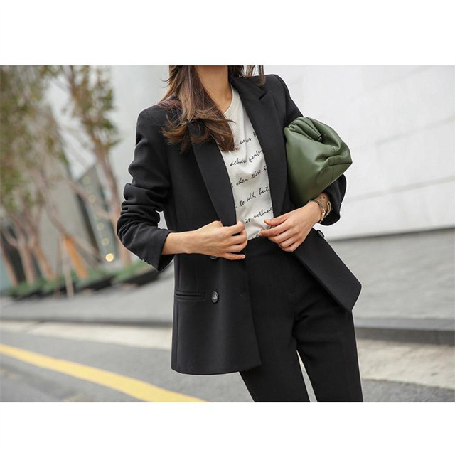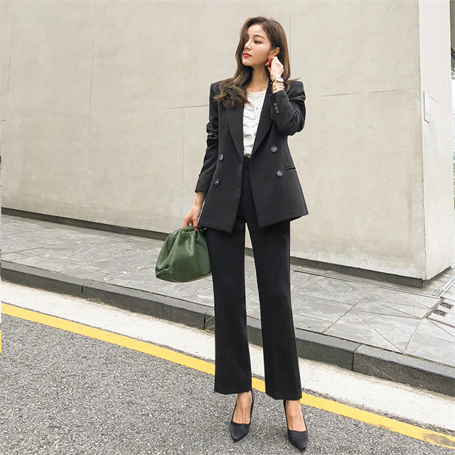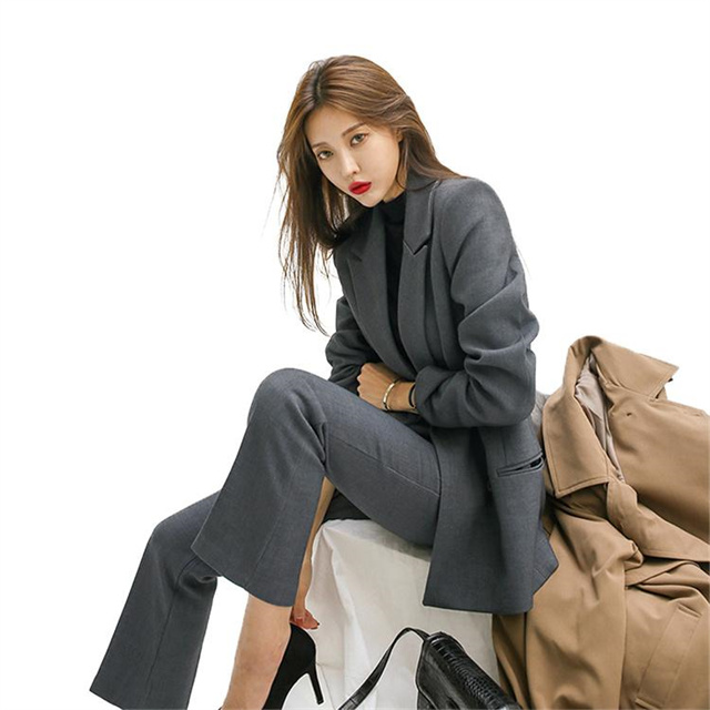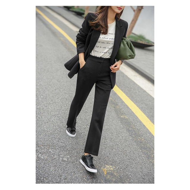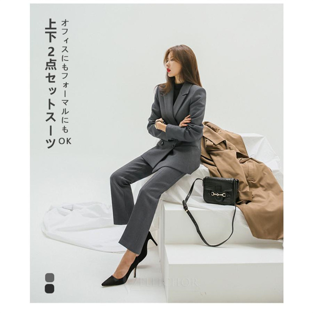 トレンドのコンパクト丈ジャケットと、ストレートパンツをセットした2点セットスーツ