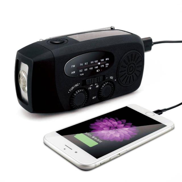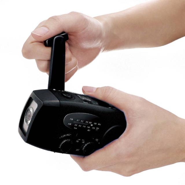 3つの充電方法が可能(USBケーブル充電、手回し充電、太陽光充電)