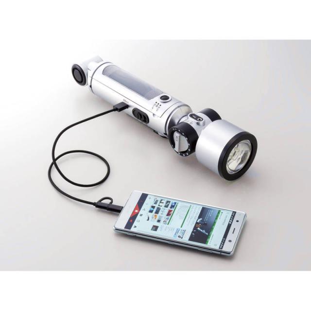 ケーブルをつなぐだけで乾電池及び蓄電された内部電源からスマホの充電が可能。