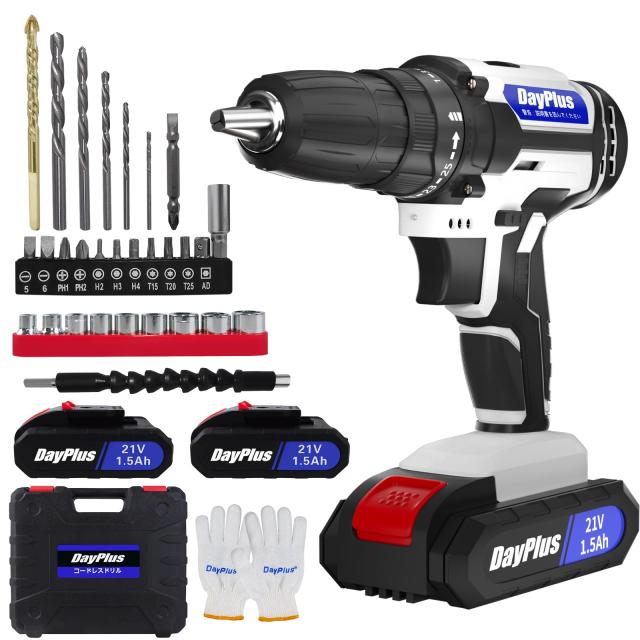 DayPlus 電動ドリルドライバー 21V 充電式 最大45N・m 25+1段階トルク調節 電池2個付属 コンパクト設計 LEDライト内蔵 初心者向け DIY家