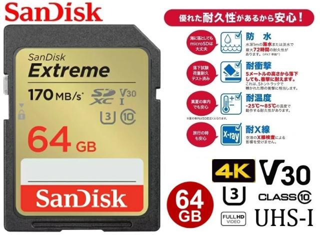 64GB サンディスク SDXCカード 64GB SanDisk U3 V30 Class10対応 170MB/s SDメモリカード 4K対応 Full HD録画 SDSDXV2-064G-GNCIN